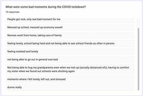 Majority had the same base idea of that people were not able to see others and that social interaction was lowered. Some mentioned that their school grades could have been better and that moving to a more online world allowed people to come together.